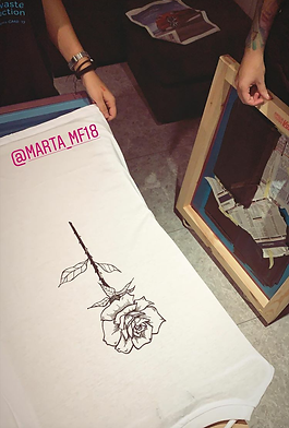 Primer de tot havia de cobrir amb papers (enganxats amb cinta de paper) tota les zones exceptuant el disseny a estampar. Seguidament vaig fer unes proves en paper d’aquarel·la per comprovar que no hagués posat massa tinta de la necessària, que no hi hagi filtracions etc; i quan considerava que ja estava tot assegurat, col·locava un cartró dins la peça a estampar i a poc a poc anàvem baixant la pantalla a la peça; Amb l’ombra que es creava a la peça, ja que la llum passa atraves de la malla, miràvem que quedes situat allà on ho volíem plasmar. Llavors amb la rasqueta passàvem una primera capa suau i tot seguit agafada amb les dues mans una segona capa prement amb força. I així amb la resta de dissenys, que de 6 en vaig fer 5 ja que vaig fer dos cops un dels dissenys i com tan sols disponia de 6 teixits en aquell moment, només he estampat 5 dissenys.